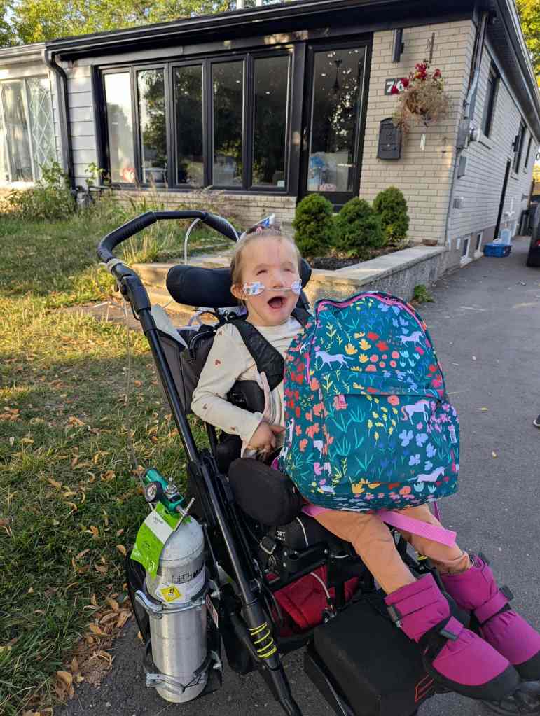 Sometimes I wish I could fold this photo into an envelope and mail it backwards in time. Push through the limits of physics, and send the snapshot the other way. I’d send it to myself in the NICU. Or to when I first learned about Trisomy 13. When I was hopeless. Scared. Anxious. Back then, I couldn’t imagine a day like this: Bree upright in her chair, her backpack as big as her torso, grinning as if the world were opening its doors just for her.